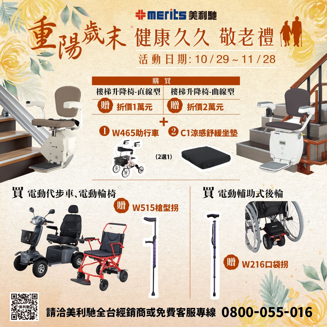 ・直線型:折價 $10,000 加贈 C1涼感舒緩坐墊 或 W465 四輪助行車